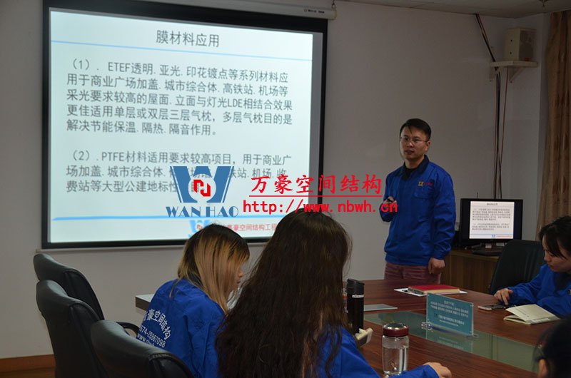 然后,我們的銷售主管教員工們學習了膜材料分類、膜結構優勢及應用領域、膜結構產品結構形式等。