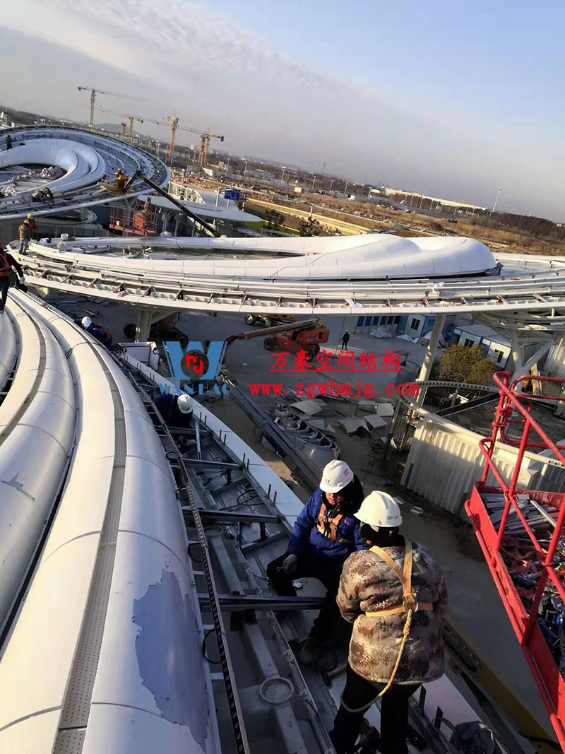 本工程鋼結構為單層雙曲網殼結構體系,平面上為對稱結構,大翅膀長跨約 50m,短跨約 25m,小翅膀長跨約 35m,短跨方向約 15m。建筑頂面為雙曲造型,建筑物最高點標高約17米??傆娩摿?00噸,膜體總面積約7000平方米。