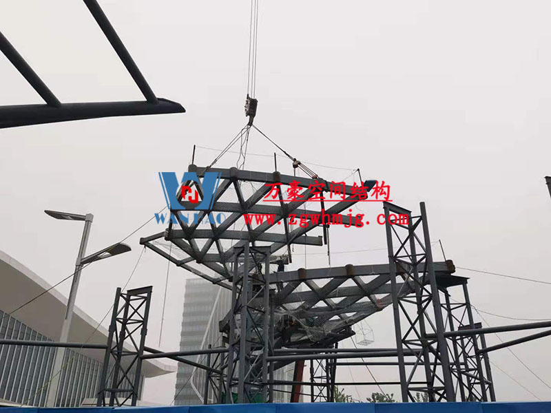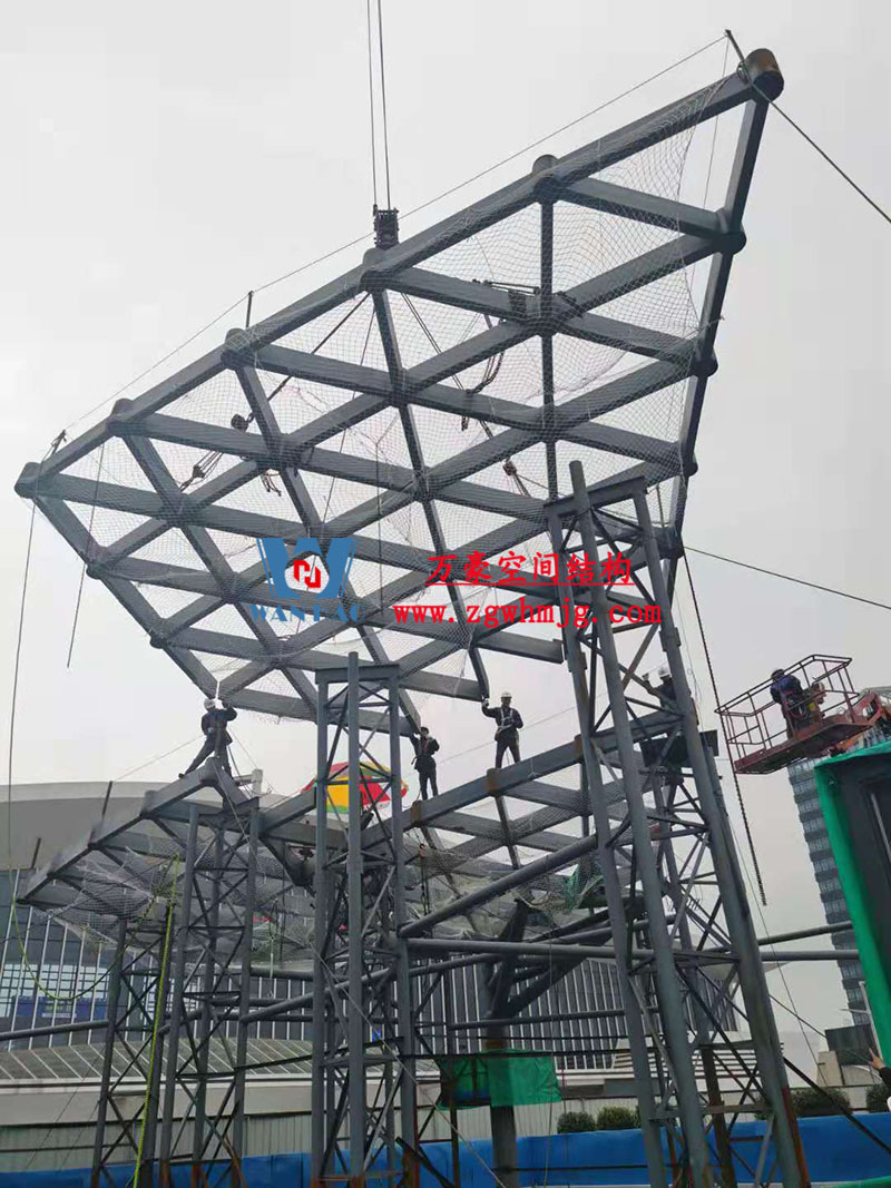 本工程鋼結(jié)構(gòu)為單層雙曲網(wǎng)殼結(jié)構(gòu)體系,平面上為對(duì)稱結(jié)構(gòu),大翅膀長(zhǎng)跨約 50m,短跨約 25m,小翅膀長(zhǎng)跨約 35m,短跨方向約 15m。建筑頂面為雙曲造型,建筑物最高點(diǎn)標(biāo)高約17米。總用鋼量800噸,膜體總面積約7000平方米。