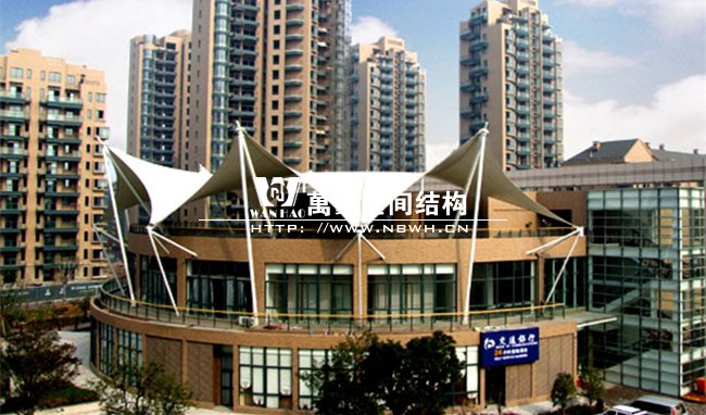 工程屹立在寧波鄞州區(qū)紫郡小區(qū),作為小區(qū)售樓處屋頂景觀,整體工程有8片單體膜組成,每片單體膜展開面積約50平方米,結(jié)構(gòu)造型飄逸輕盈,結(jié)構(gòu)受力有墻體承載,為張拉式膜建筑的典型代表,膜材高低起伏,形如波濤拍岸。極具現(xiàn)代化氣息,和諧的融與環(huán)境,成為商業(yè)小區(qū)的一道亮麗風景線。